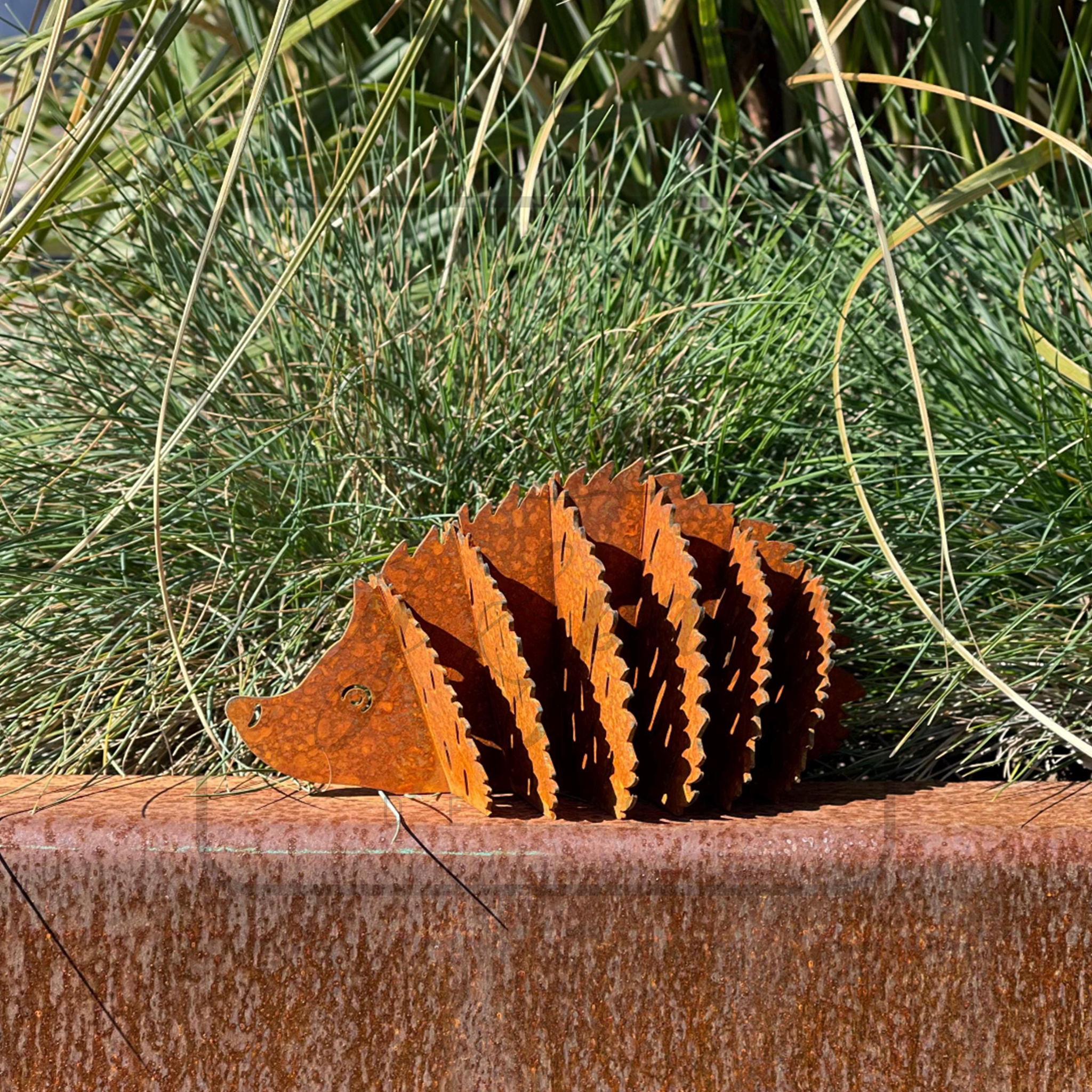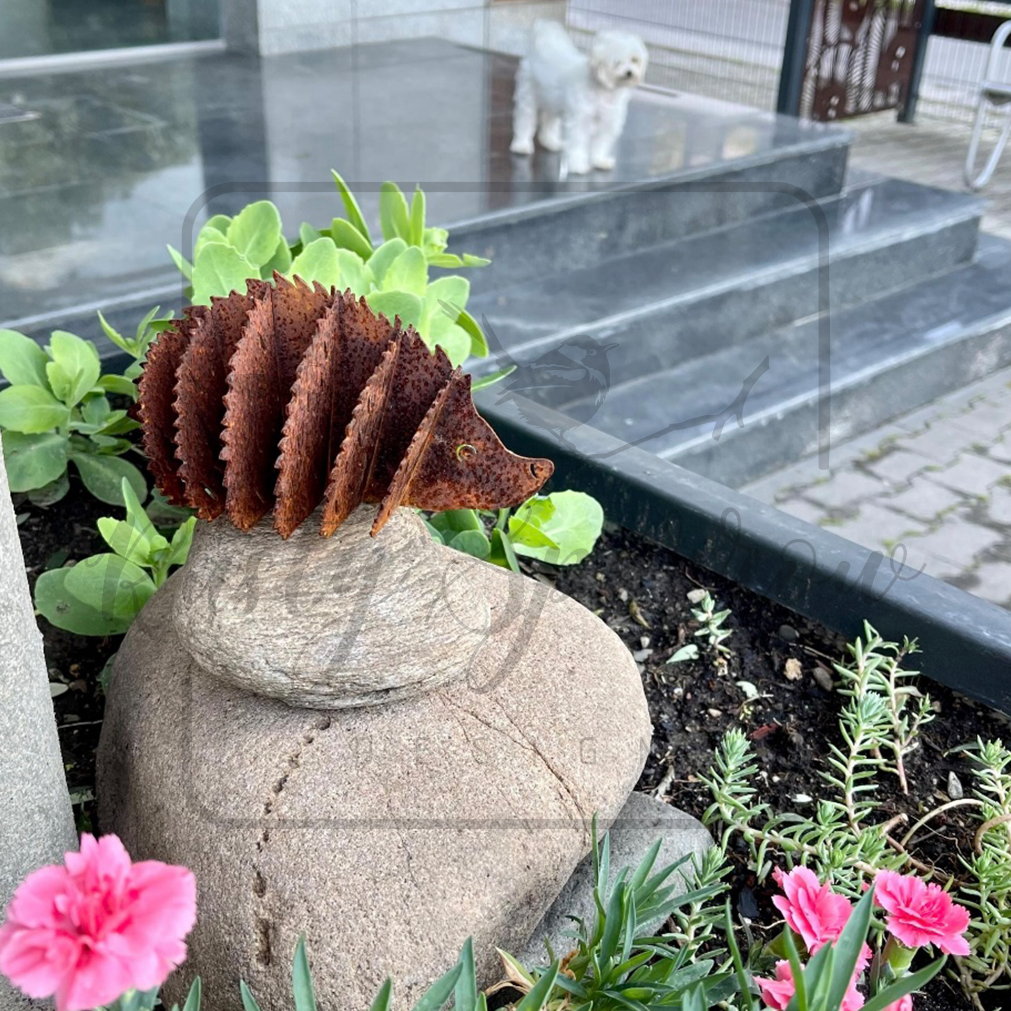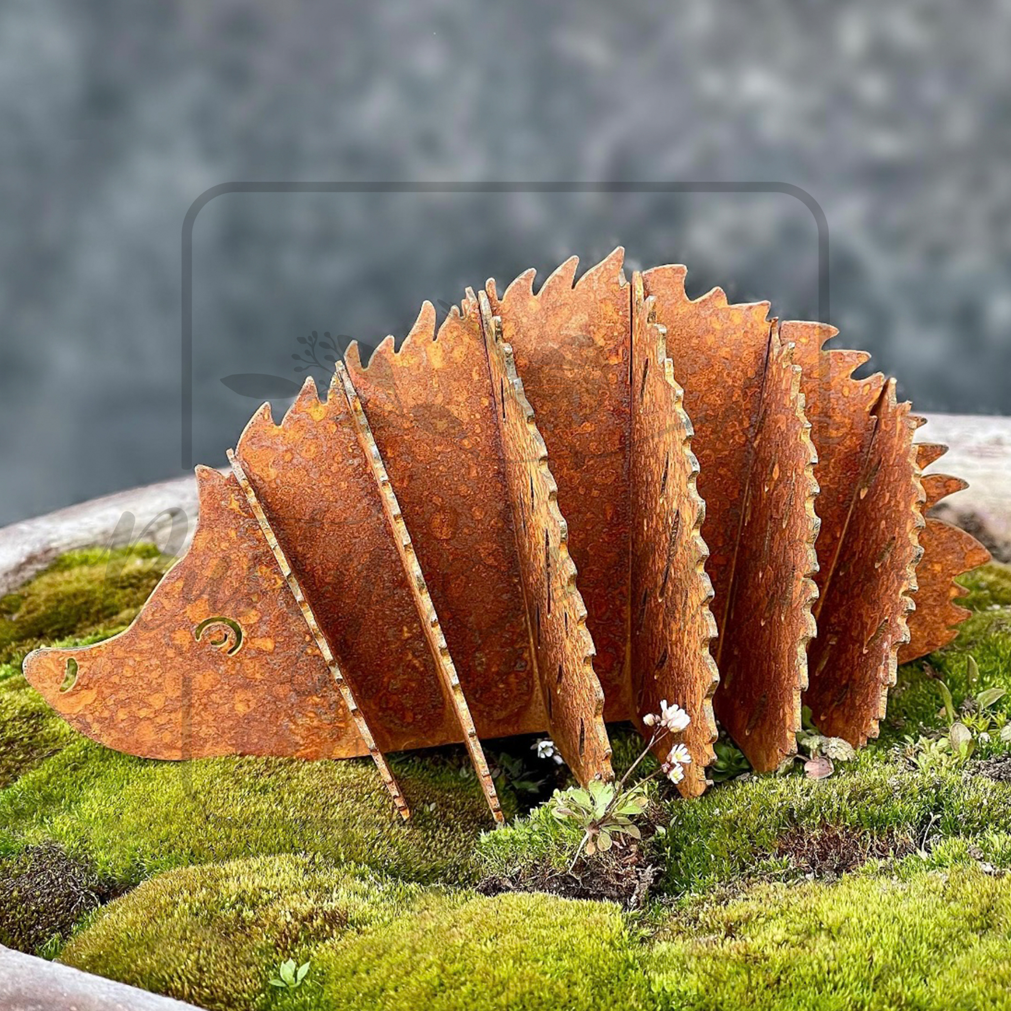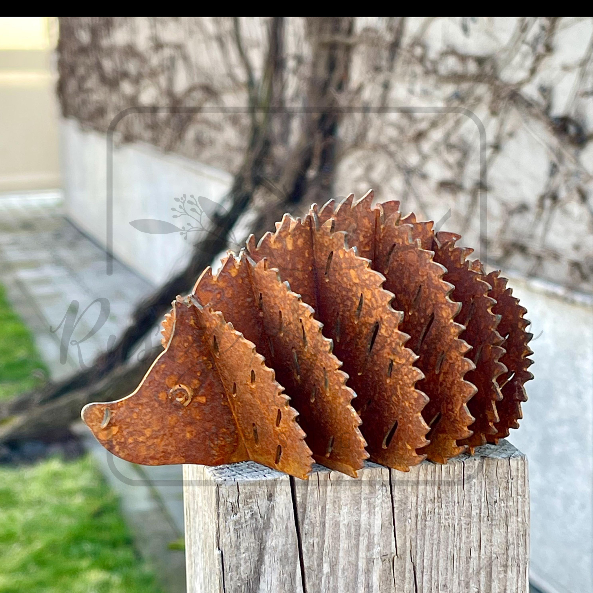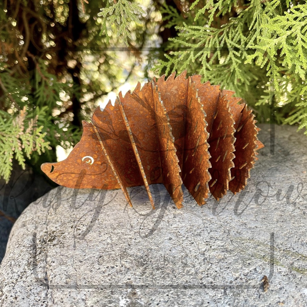 You are now looking at a rusted metal hedgehog sculpture that would look wonderful in your yard, in front of your window, on a shelf, as a centerpiece on your table, or anywhere else your imagination desires. Symbolizing protection, resilience, and curiosity, hedgehogs bring a sense of charm and warmth to any space.